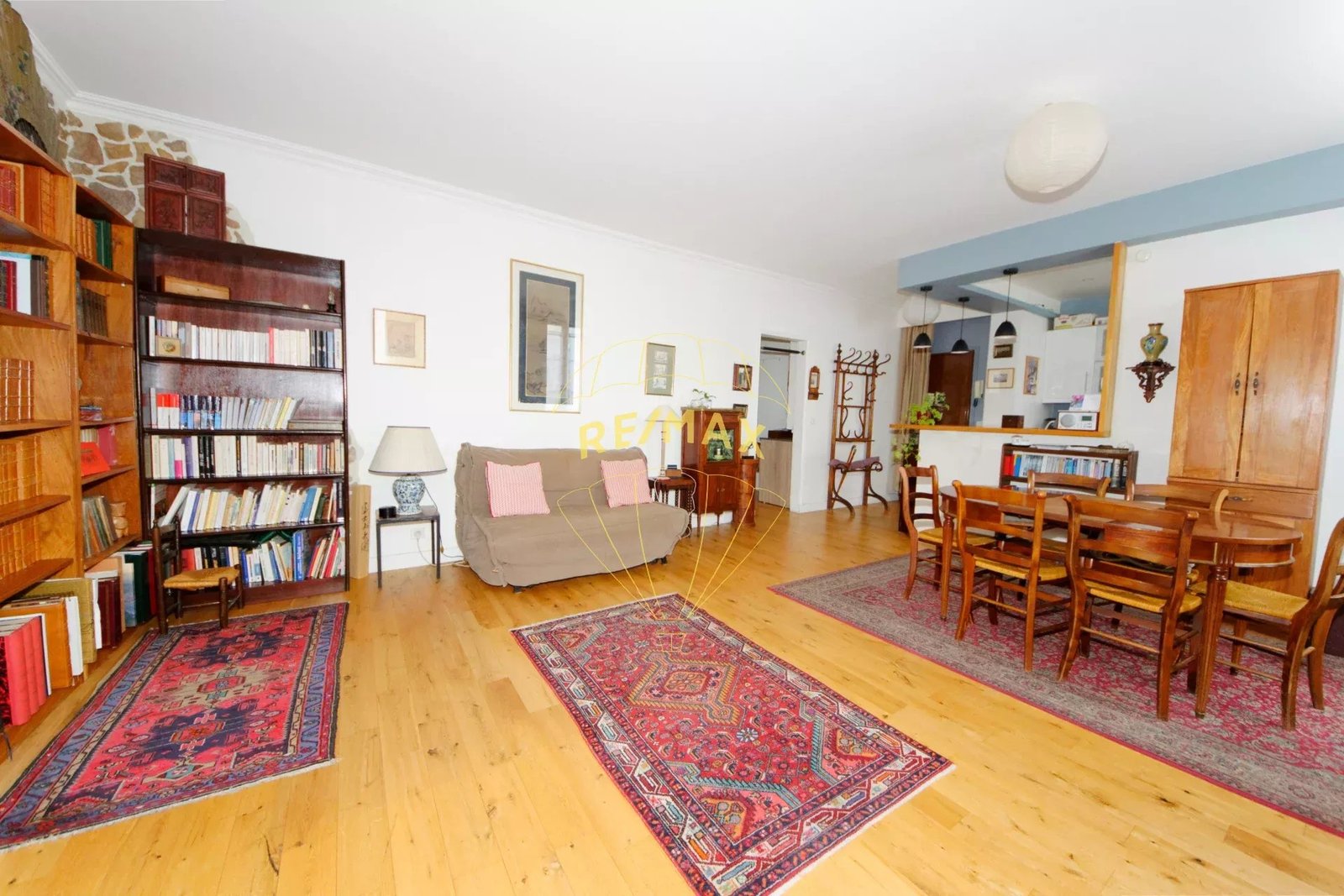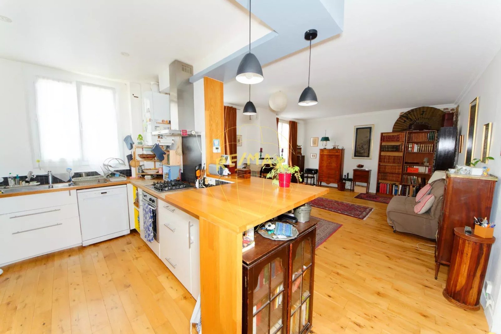 Pièce de vie de 38 m² avec cuisine ouverte et cheminée fonctionnelle