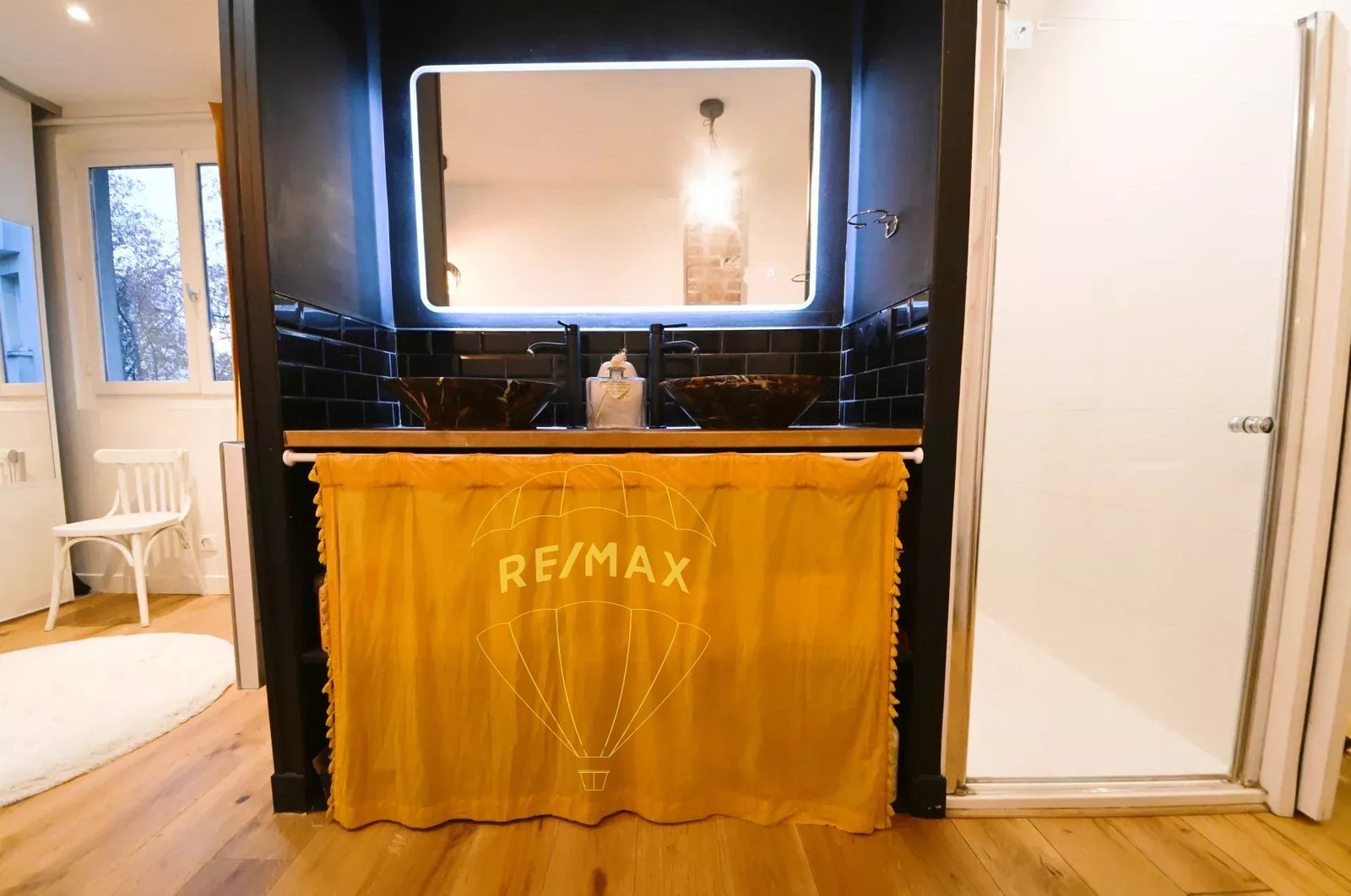 Au second étage, vous arrivez directement sur un original palier-salle d’eau. Un grand dressing occupe une partie de ce niveau, avec des toilettes séparées ; l’autre partie est réservée à la chambre.